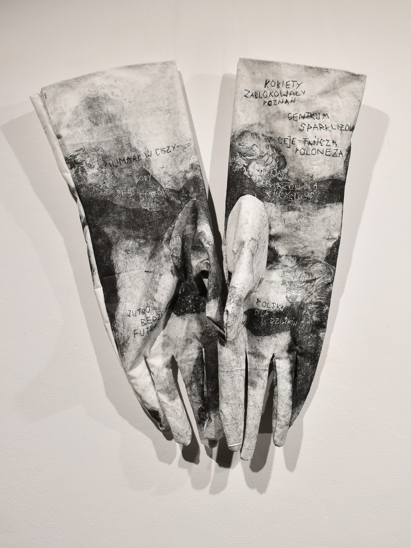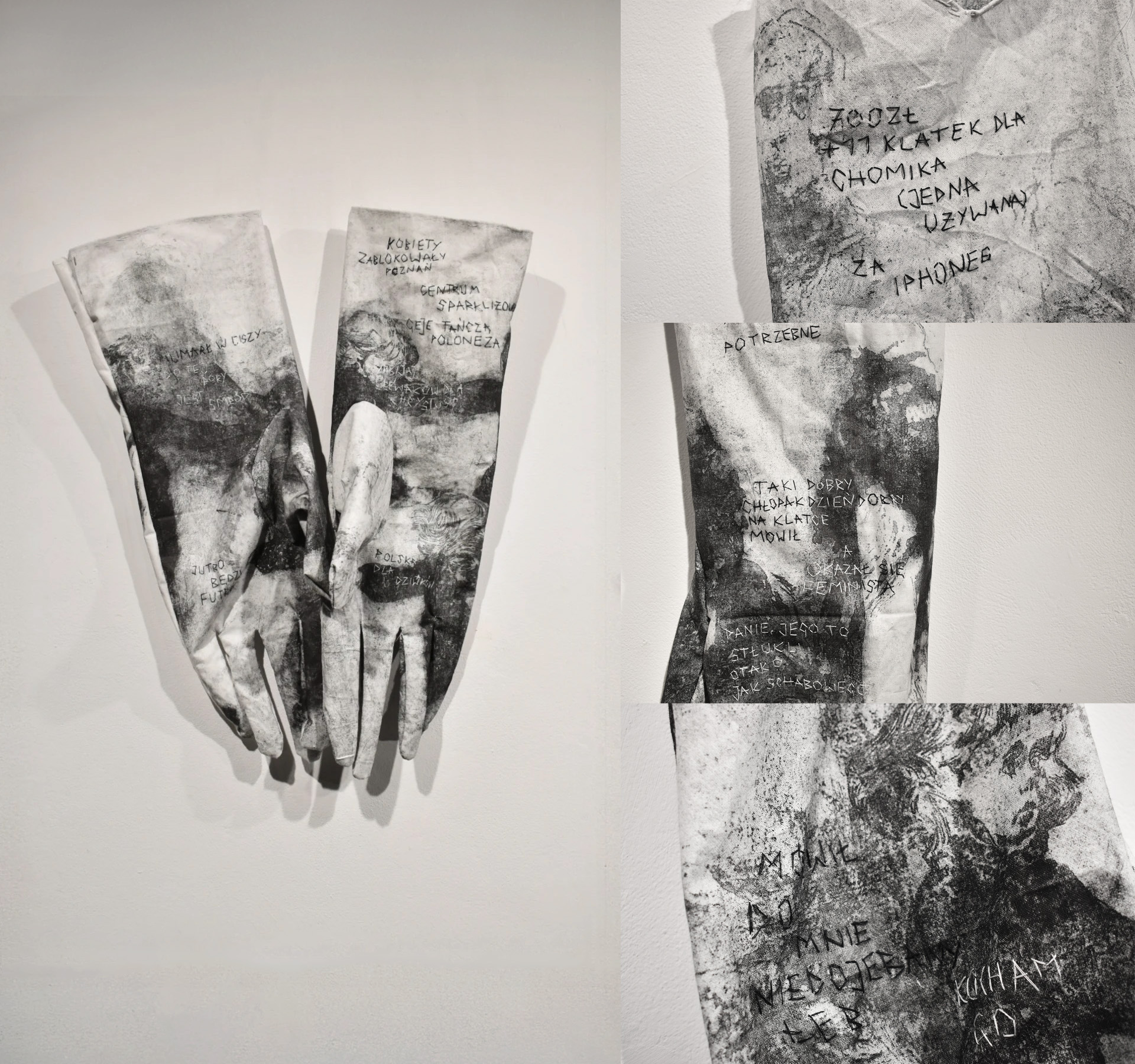 Praca stanowi refleksję nad powolnym zamieraniem etosu pracy – idei, która przez dekady stanowiła fundament tożsamości jednostki i społeczności. Ręcznie wykonane, przeskalowane rękawice – niedoskonałe, lecz wymagające ogromnego nakładu czasu i wysiłku są tu nie tylko symbolem fizycznej pracy, ale także jej stopniowego zanikania, stawania się widmem. W świecie, w którym wartość jednostki coraz rzadziej mierzy się wysiłkiem, a coraz częściej efektem, rękawice stają się truchłem dawnego systemu wartości – pustą skorupą po idei, która przestała być potrzebna. Praca dotyka nie tylko wymiaru społecznego, ale i egzystencjalnego – przemęczenie, frustracja, pozorny sukces, ekonomiczny absurd i nieustanne poczucie braku stają się niewidzialnymi duchami naszej codzienności. Wychowanie w kulcie pracy, przekazywane pokoleniowo schematy myślenia, dziś wracają jak echa – frazy „jutro będzie futro” czy „700 zł + 11 klatek dla chomików” brzmią jak ironiczne zaklęcia wypowiadane nad zbiorowym ciałem społecznym, które przestało już wierzyć w sens wysiłku. W tym kontekście rękawice stają się nie tyle narzędziem pracy, co pomnikiem jej śmierci – skamieniałą formą po ruchu, po geście, po wierze w to, że wysiłek ma znaczenie. To nie tylko przedmiot, ale ślad – po człowieku, po systemie, po idei.